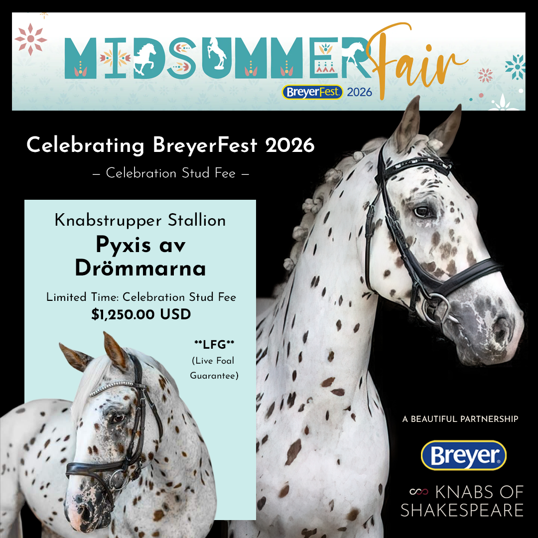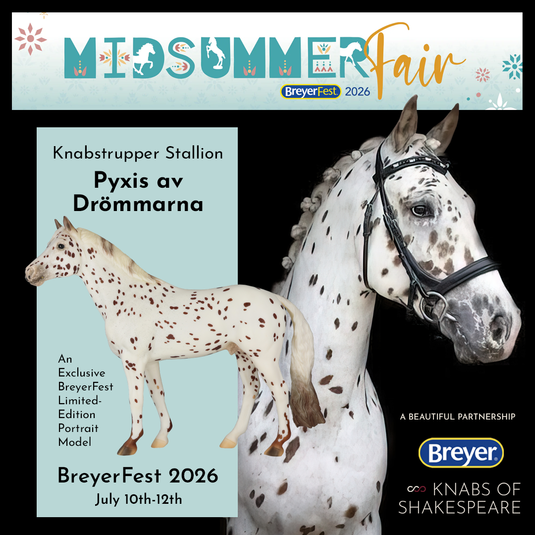 Exciting News: Shakespeare Farm is honored to announce that our very own Pyxis av Drömmarna, a Danish Knabstrupper stallion, has been selected as the inspiration for a BreyerFest® 2026 model (at right)!