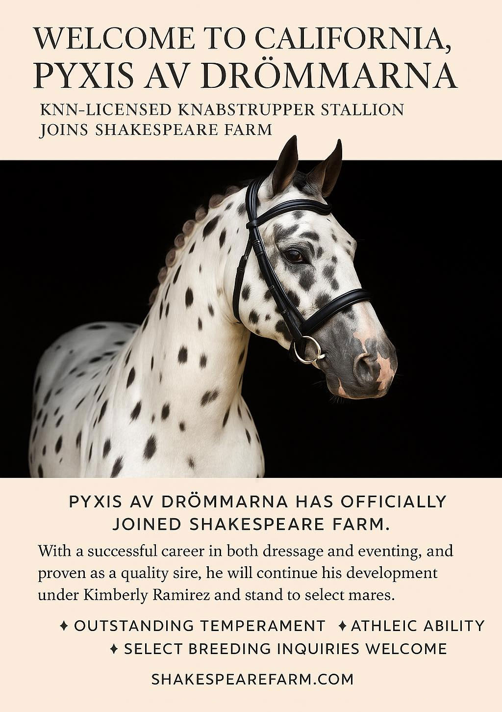 We are thrilled to share that the exceptional KNN-licensed Knabstrupper stallion, Pyxis av Drömmarna, has officially joined the Shakespeare Farm family in California.